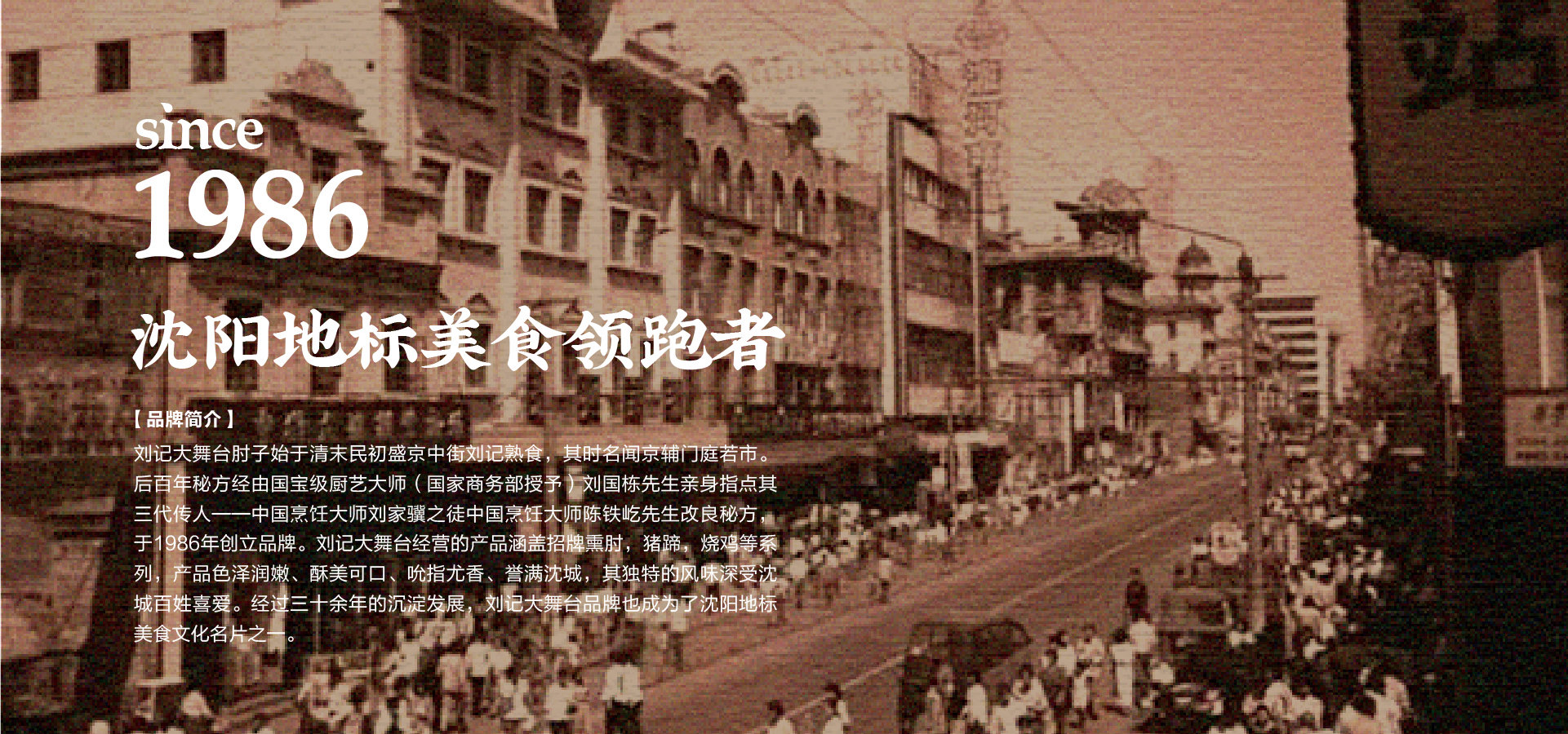 盛京,昔乃大清王朝發(fā)祥之地。劉記大舞臺(tái)肘子始于清末民初盛京中街劉記熟食,其時(shí)名聞京輔門庭若市。后百年秘方經(jīng)由國(guó)寶級(jí)廚藝大師(國(guó)家商務(wù)部授予)劉國(guó)棟先生親身指點(diǎn)其三代傳人——中國(guó)烹飪大師劉家驥之徒中國(guó)烹飪大師陳鐵屹先生改良秘方,于1986年創(chuàng)立品牌。劉記大舞臺(tái)經(jīng)營(yíng)的產(chǎn)品涵蓋招牌熏肘,豬蹄,燒雞等系列,產(chǎn)品色澤潤(rùn)嫩、酥美可口、吮指尤香、譽(yù)滿沈城,遂成古今絕味,其獨(dú)特的風(fēng)味深受沈城百姓喜愛(ài)。經(jīng)過(guò)三十余年的沉淀發(fā)展,劉記大舞臺(tái)品牌也成為了沈陽(yáng)地標(biāo)美食文化名片之一。